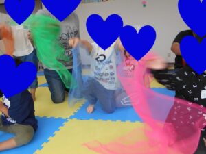 緩急ある音に合わせてカラフルな布を早く振ったり、ゆらゆら~と風に乗せてゆっくりなびかせて行いました!