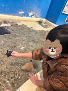 実際に水に触れられるコーナーでは、勇気を出して、ヒトデをキャッチ!