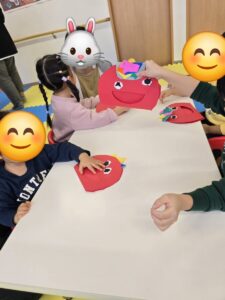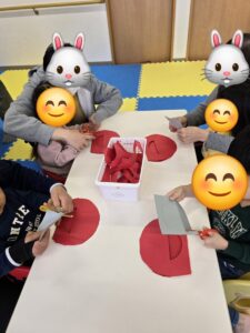 みんなでハサミ✂️でチョキチョキ😃✂️✨形を切り糊で鬼の表示をぺたぺたして作りました。